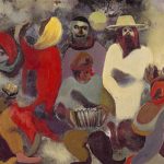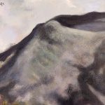 Geabstraheerd berglandschap in roze en blauwe tinten.